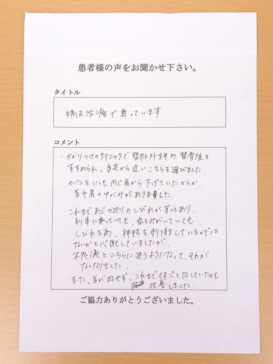 これまで、あごの辺りのしびれがずっとあり、列車に乗っていても、歯をみがいていてもしびれる為、神経を刺激しているのではないかと心配していましたが、不思議とこちらに通うようになって、それがなくなりました。